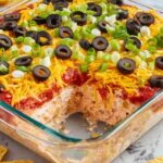 This classic 7 Layer Dip is a vibrant, flavorful appetizer perfect for parties and gatherings. Featuring layers of refried beans, creamy guacamole, seasoned sour cream, salsa, cheese, olives, and green onions, it pairs perfectly with crunchy tortilla chips for a crowd-pleasing snack.