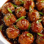 - Garnish and Serve: Transfer glazed meatballs to a serving dish and garnish with extra sliced green onions and sesame seeds. Serve hot as a main dish or appetizer.
