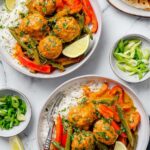 - Serve: Spoon meatballs and curry sauce over cooked jasmine rice. Garnish with chopped scallions and/or cilantro and lime wedges. Serve with naan or pita bread to soak up extra sauce if desired. Enjoy!