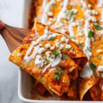 Experience the bold and creamy flavors of Buffalo Chicken Enchiladas, featuring shredded chicken wrapped in tortillas, smothered in a spicy buffalo tomato sauce with melted cheese, perfect for a flavorful and comforting meal.