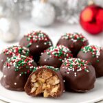 - Optional garnish and chill: Sprinkle holiday-themed candy sprinkles onto the tops of the chocolate-coated pecan pie balls if desired. Refrigerate uncovered for 2 hours to allow the chocolate to firm up before serving.