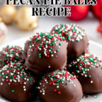 Using a fork, carefully dip one pecan ball at a time into the melted chocolate. Roll it gently to coat fully, then lift it out on the fork and set back on the parchment-lined sheet. If you want to get festive, sprinkle holiday themed candy sprinkles on top right after dipping. Once you’re all done, pop the tray in the fridge uncovered so the chocolate can harden (about 2 hours).