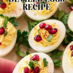- Garnish and serve: Top each deviled egg with one parsley stem and 2 to 3 pomegranate seeds for a festive look. Serve immediately or refrigerate until ready to serve.