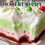 A festive and creamy Christmas Lasagna Dessert featuring a red velvet cookie-like base, layers of cream cheese and peppermint, green vanilla pudding, and topped with whipped topping and holiday sprinkles. Perfect for holiday gatherings and easy to prepare ahead.