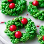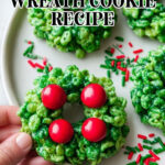 These festive Christmas Wreath Cookies are a crunchy, sweet holiday treat made with cornflakes and marshmallows, colored green and decorated with red candies to resemble mini wreaths. Perfect for holiday gatherings and easy to make with simple ingredients.