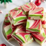 This Christmas Fudge recipe is a festive and rich treat made with creamy white chocolate, sweetened condensed milk, and swirled with red and green gel food coloring for a holiday-inspired look. Perfect for gifting or enjoying during the holiday season, this smooth and creamy fudge sets firm after chilling and can be easily sliced into bite-sized pieces.