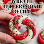Delightful wreath-shaped butter cookies featuring a festive swirl of colored dough and topped with sprinkles. Perfect for holiday celebrations, these buttery treats have a tender texture and are easy to pipe onto baking sheets for charming presentation.