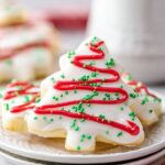 - Cut Tree Shapes: Use a Christmas tree-shaped cookie cutter to carefully cut trees out of the filled cake layers. Place the cut trees on a parchment-lined baking sheet. To make cutting easier, freeze the filled cake for 30 minutes beforehand if needed.