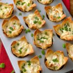 - If you don’t have a 24-count mini muffin tin, use a regular 12-count muffin tin by layering two wonton wrappers offset to prevent overlapping corners, then double the filling per cup. This will yield 12 larger wonton cups.
