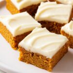 - Frost the bars: Once the pumpkin bars are completely cooled, spread the cream cheese frosting evenly on top. Slice into 18 bars and serve.