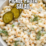 Each ingredient in this Creamy Dill Pickle Pasta Salad Recipe works together to balance tanginess with creaminess and a hint of herbaceous freshness. When you shop, look for good-quality dill pickles and fresh dill to get that signature flavor.