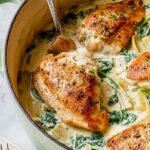 Spinach Artichoke Chicken is a creamy and flavorful skillet dish featuring tender chicken breasts smothered in a rich sauce made with fresh spinach, artichoke hearts, Neufchatel cheese, parmesan, and sour cream. This comforting recipe is perfect for an elegant yet easy dinner that combines the beloved flavors of spinach artichoke dip with wholesome protein.