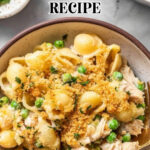 A comforting Tuna Noodle Casserole made with shell pasta, creamy cheese sauce, tender tuna, and peas, topped with a crispy panko breadcrumb and parmesan topping. Perfect for a hearty weeknight dinner or meal prep.