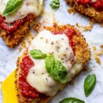 This Air Fryer Chicken Parmesan recipe features crispy breaded chicken breasts topped with savory marinara sauce and melted mozzarella cheese, garnished with fresh basil for a delicious and healthier take on the classic Italian-American dish. The air frying method ensures a crispy exterior without deep frying, making it quick and easy for a weeknight dinner.