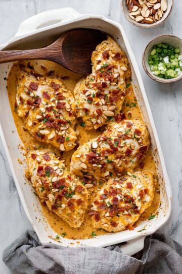 Million Dollar Chicken is a delicious baked chicken recipe featuring tender chicken breasts topped with a creamy, cheesy mixture loaded with crispy bacon and crunchy almonds. This flavorful dish pairs wonderfully with rice, pasta, or vegetables for a satisfying meal.
