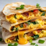 A quick and savory breakfast tortilla filled with sautéed red peppers, crispy bacon, wilted spinach, scrambled eggs, and melted cheddar cheese, all wrapped in a crispy flour tortilla. Garnished with scallions and hot sauce for an extra kick.