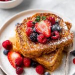 Brioche and challah are my favorites because they’re rich, soft, and thickly sliced, great for soaking up custard without falling apart. Day-old bread works best so it doesn’t get soggy while dipping.