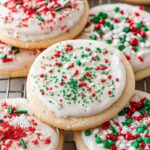 - Decorate Cookies: Allow the cookies to cool completely on a wire rack. Spread a small amount of melted white chocolate or vanilla almond bark on each cookie and immediately add holiday sprinkles. Let the topping set for about 15 minutes before serving.