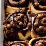 - Cool and Glaze: Let the rolls cool in the pan on a wire rack for 15 minutes before pouring the chocolate glaze evenly over the top. Optionally, garnish with chocolate pearls, shavings, or sprinkles before serving.