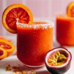 A refreshing Frozen Passion Fruit Mezcalita combining tropical passion fruit purée with smoky mezcal and citrusy orange juice, lightly sweetened with agave nectar for a perfectly balanced, smooth cocktail.