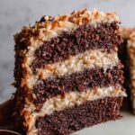 Traditional German Chocolate Cake featuring rich chocolate layers and a decadent coconut pecan frosting. This classic dessert combines moist cake with a creamy, nutty frosting, perfect for celebrations or special occasions.