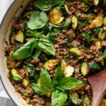 This Ginger-Basil Beef and Zucchini Skillet is a flavorful and quick-to-make dish featuring lean ground beef cooked with fresh ginger, garlic, and aromatic basil. The zucchini adds a tender, slightly caramelized texture, while the savory sauce made from soy sauce, rice vinegar, fish sauce, and Gochujang gives it a spicy, tangy kick. Perfect served over jasmine rice or wrapped in bibb lettuce cups for a lighter option.