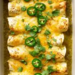 - Garnish and serve: Remove the enchiladas from the oven and top with thinly sliced jalapeños and fresh cilantro leaves. Serve warm and enjoy.