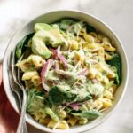 - Serve and Garnish: Portion the salad into shallow bowls or plates. Top each serving with sliced or cubed avocado, drizzle with the remaining dressing, and sprinkle with freshly grated parmesan cheese. Optionally, add a pinch of salt, freshly cracked black pepper, and some fresh basil leaves for extra flavor.