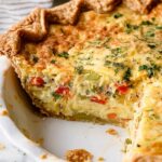 This classic ham and cheese quiche features a buttery homemade pie crust filled with a rich custard of eggs, heavy cream, ham, Gruyere and Gouda cheeses, and sautéed vegetables including asparagus, onion, and red bell pepper. It’s perfect for brunch, lunch, or dinner and can be made ahead, frozen, and reheated with ease.