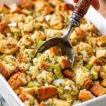 - Bread Cubes: For best results, bake your own sourdough or similar bread loaf cut into ½ inch cubes on 300F (150C) for about 25 minutes until crisp and dried throughout. Start with about 1 pound of fresh bread to yield 10 cups dried.
