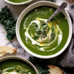 Submerge your kale leaves gently under the liquid—pushing them down with your spoon or spatula—and use a stick blender to puree until the soup is mostly smooth but still has little flecks of green for a lovely texture. Add the baby spinach, gently push it under, and blitz again until as smooth as you like, usually 3 to 5 minutes. Don’t worry if it’s not perfectly uniform—that bit of green texture is charming!