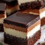 Decadent Irish Cream Frosted Brownies featuring a rich chocolate brownie base layered with smooth Irish Cream frosting and topped with a luscious Irish Cream ganache. Perfect for celebrations or indulgent treats.