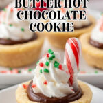 These Peanut Butter Cup Hot Chocolate Cookie Cups are a festive holiday treat combining soft sugar cookie dough baked into mini cups filled with a melted peanut butter cup, decorated with candy cane handles, white icing, marshmallow bits, and holiday sprinkles for a delightful and fun dessert perfect for holiday parties.