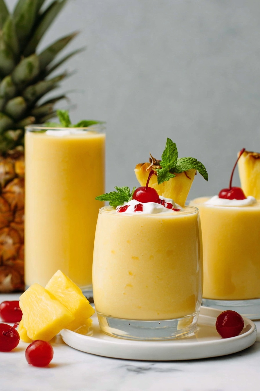- Serve and Garnish: Pour into glasses and optionally top with coconut whipped cream, cherries, fresh pineapple slices, and fresh mint for a festive touch.