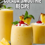 Pour your luscious Piña Colada Smoothie into glasses. For a festive flair, top with a dollop of coconut whipped cream, a bright cherry, fresh pineapple slice, and a sprig of mint. Not only does it add color and texture, but it also enhances those coconut-pineapple vibes.
