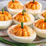 Pumpkin Deviled Eggs are a festive and creative twist on classic deviled eggs, perfect for fall gatherings and Halloween parties. Creamy yolk filling flavored with mayonnaise, mustard, and paprika is piped into egg whites, then decorated to look like tiny pumpkins with chive stems and paprika ridges.