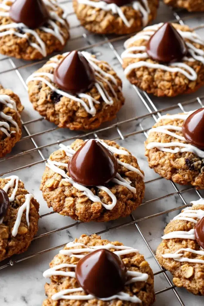 Delightful Cherry Blossom Cookies featuring whole rolled oats, warm spices, dried tart cherries, and a chocolate kiss center, optionally topped with a vanilla almond bark drizzle.