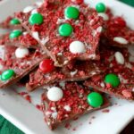 This festive Christmas Bark with Red Velvet Cookie combines creamy melted milk chocolate with crunchy red velvet cookie pieces and colorful mint M&Ms for a delightful holiday treat. Quick to make and perfect for gift-giving or holiday gatherings, this no-bake dessert is both visually appealing and delicious.