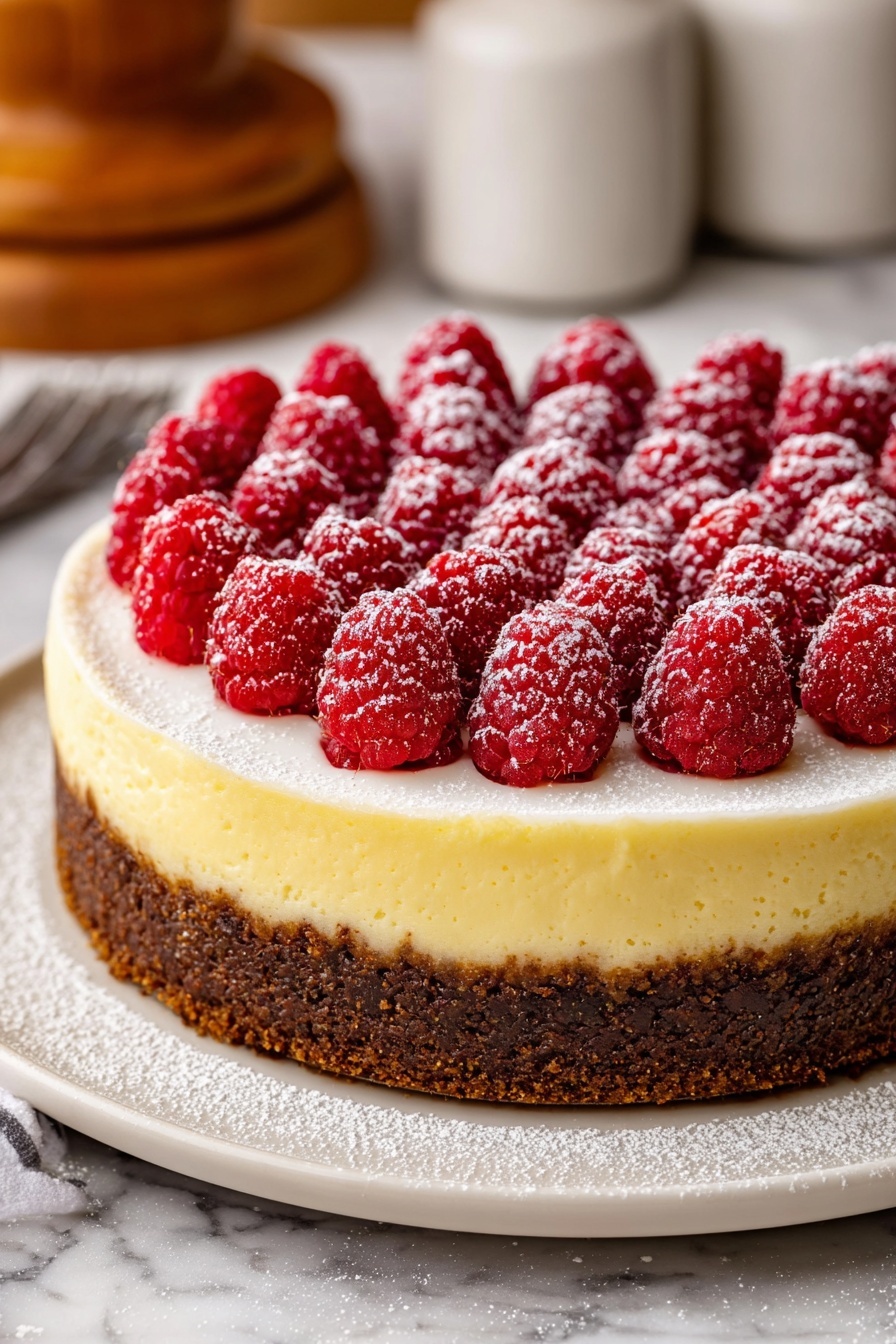 Now the best part — decorate! I love fresh raspberries or sliced strawberries on top, but chocolate chips or a drizzle of honey work equally well. Slice carefully and serve. Enjoy that delicate balance of tangy, creamy, and zesty flavors.