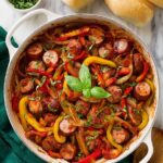 This classic Sausage and Peppers recipe features Italian sausage links cooked with colorful bell peppers, onions, and a savory tomato-based sauce garnished with fresh basil and parmesan cheese. Perfect for a hearty dinner served on its own, with pasta, rice, or inside hoagie buns.