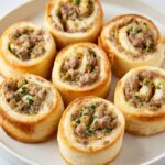 Sausage Pinwheels are a delicious and savory appetizer featuring a flavorful blend of browned breakfast sausage, cream cheese, cheddar, and green onions wrapped in crescent roll dough. Baked to golden perfection, these pinwheels are perfect for parties, brunches, or snack time.
