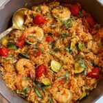 A quick and flavorful Shrimp and Rice Skillet recipe featuring sautéed zucchini, seasoned garlic, cherry tomatoes, and perfectly cooked shrimp all simmered in a savory tomato and chicken broth base. Ideal as a hearty and simple weeknight meal.