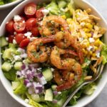 A vibrant chopped salad featuring perfectly spiced and sautéed shrimp tossed with fresh romaine, tomatoes, cucumber, corn, avocado, and a zesty cilantro lime vinaigrette. This refreshing and colorful salad is topped with tangy Casero cheese and crunchy tortilla chips, making it a delightful and satisfying meal perfect for lunch or dinner.