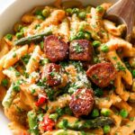 While your pasta water’s heating up (don’t forget to salt it generously!), I drop the asparagus in for just a few minutes until it’s tender-crisp. Then into an ice bath right away to keep that vibrant green color and fresh crunch. After that, cook the pasta until al dente. Keep half a cup of that starchy pasta water tucked away — it’s liquid gold for thinning your sauce later if needed.