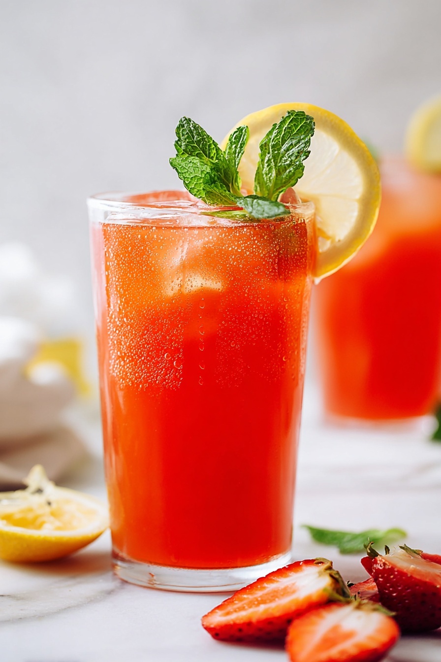 Brighten up your Strawberry Lemonade by garnishing with fresh strawberry slices, lemon wheels, or a sprig of fresh mint. A rim of sugar or a touch of edible flowers can also amp up the visual appeal and add an extra hint of sweetness.