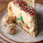 This Sugar Cookie Cheesecake combines a buttery sugar cookie crust, festive cookie dough balls, and a rich, creamy cheesecake layer, all topped with a luscious white chocolate ganache and colorful Christmas sprinkles. Perfect for holiday celebrations, it offers a delightful blend of textures and flavors that will impress your guests.