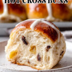 Classic British hot cross buns made with a soft, spiced dough studded with dried fruit, glazed with apricot jam and topped with a sweet vanilla icing cross. Perfect for Easter or any cozy tea time treat.