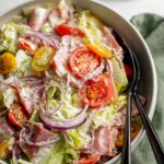 A fresh and flavorful Grinder Salad inspired by classic sub sandwich ingredients, tossed in a zesty homemade dressing and loaded with crunchy lettuce, cherry tomatoes, onions, cheeses, and a variety of deli meats for a hearty and delicious meal.