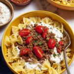 This Turkish Pasta Recipe combines tender farfalle pasta with a rich ground beef meat sauce, creamy garlic yogurt sauce, and a flavorful butter sauce infused with paprika and red pepper flakes, garnished with fresh tomatoes, dried mint, and sumac for an authentic, comforting meal that is quick and easy to prepare.